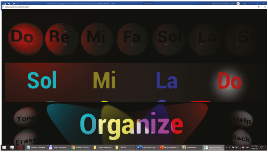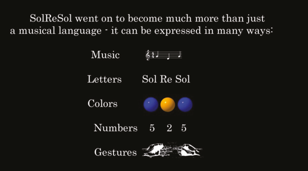 Developed in the early 19th century, Solresol is one of the first attempts at creating an a priori international auxiliary language that predates the more popular Volapuk and Esperanto. Its uniqueness is manifested in the potentially infinite number of semiotic systems: described as a language of music with its seven-tone inventory, it also incorporates such signs as solfège, the seven spectral colors, numbers, gestures, etc.