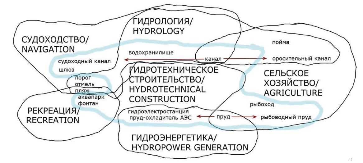 Терминосистема гидротехники, безусловно, относится ко второй модели. Научная речь, функционирующая в сфере гидротехники, характеризуется комплексной терминосистемой, включающей в себя различные отрасли науки и практики, или дословно: «The scientific speech functioning in the field of hydrotechnics is characterized by a complex term system, which involves elements from various branches of science and practice» [23. Р. 319]. В терминосистему гидротехники входят термины и терминополя смежных специальностей, таких как гидрология, гидромелиорация, безопасная эксплуатация ГТС, экология, строительство, судоходство и др.