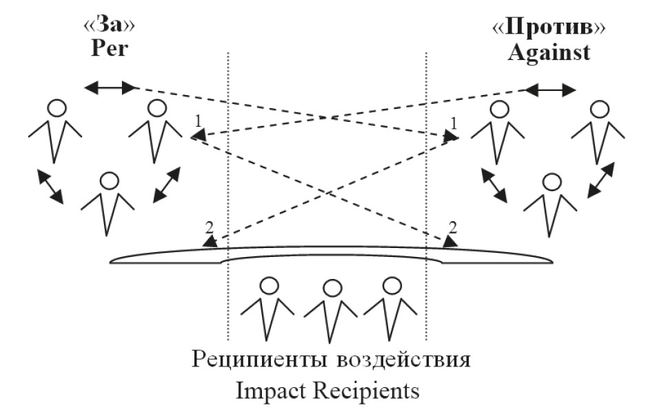 Любое воздействие групп друг на друга (цифра 1 на рис. 1) сопровождается своеобразным, так сказать, «отскоком» (на схеме цифра «2») в область пока еще не вовлеченных в конфликт масс людей (реципиенты воздействия внизу на изображении), «обволакиваемых» деформируемым смысловым полем. Перекрестие «вторичного влияния» (по центру схемы) становится невидимым каркасом повторяющегося процесса идеологизации, который затрагивает не только современников, но и последующие поколения [24]. Воздействие может прослеживаться по пяти «параметрическим» связкам процессов: 1) привлечением определенных языковых средств, 2) поляризацией оценки, 3) прецедентностью текста, 4) идеи и 5) образа руководителя, поддерживающего победившую в полемике группу людей[2].