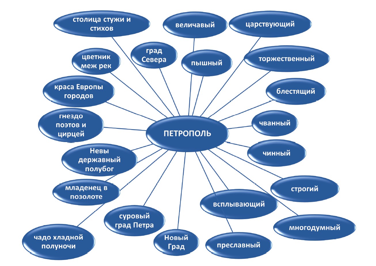 Геопоэтический образ придает местам особый смысл, это «сочетание ярких, характерных, знаков, символов, ключевых представлений, описывающих какие-либо реальные пространства» [18. C. 48]: Петербург с его красою стройной, с блестящим поясом роскошных островов (П. Вяземскиий); Ты всех прекрасней — несравнимый блистательный Санкт-Петербург! Преславный град, что Петр наш основал (В. Тредиаковский). Он поплывет в высоком море — небесный Петербург теней (Е. Шварц). В регулярном, как Петербуог петровский, мире (Б. Слуцкий); мой Петербург, мой колокол пожарный… // Петербург, мое окно (И. Бродский), Снежно-белый, холодный от метелей и пург // над Невой благородной онемел Петербург (М. Цейтлин); Петербург, исхлестанный бичами пург (Н. Клюев). Сплетение идей и смыслов в художественно-философской глубине их осознания на фоне географической конкретизации воспроизводят пространственно-временную картину мира в ее символико-идеологическом аспекте.