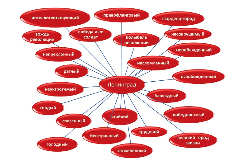 На фоне положительных характеристик художественно моделируемой действительности знаками негативной оценки внутреннего состояния объекта становятся концептуальные знаки — сильные прагмемы блокадный (‘окруженный противником’), голодный (‘скудный продуктами’), затемненный (‘маскирующий свет’), выражающие причину как зло, которое устраняют. Метафора палимпсеста обнаруживает также аллюзии (скорее даже логоэпистемы), констатирующие символический ореол Ленинграда: колыбель революции, вождь революции, солдат победы как знаки национального языкового сознания и менталитета. Таким образом, аксиологическая модель геопоэтического образа Ленинграда обобщает сильные знаки-прагмемы: победитель — стойкий (несломленный) — лучший — в борьбе со злом.