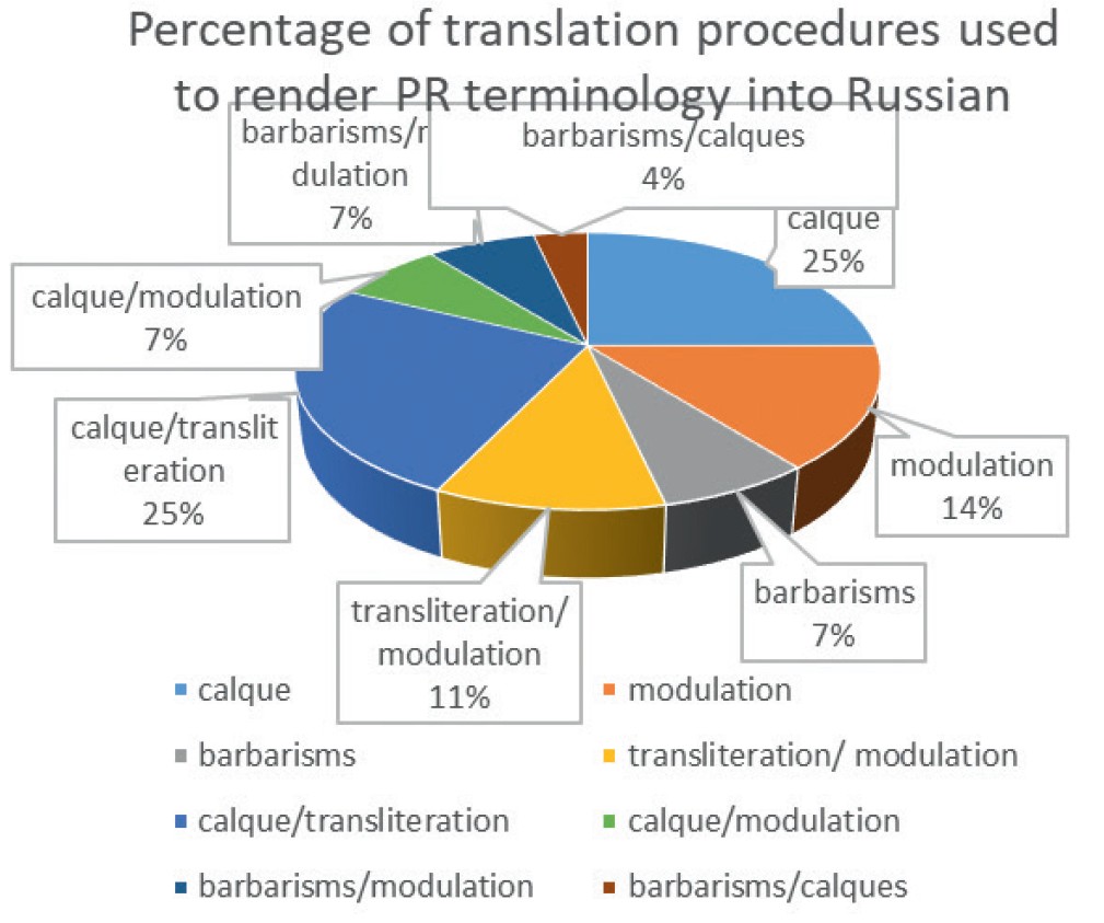 Some PR terminology requires more than one translation strategy to be used by the translator. The conducted analysis has revealed that procedures most frequently used for PR terminological translation are calque + transliteration (25 %), calque (25 %), modulation (14 %), modulation + transliteration (11 %). The pie chart in Picture 1 shows in the majority cases during the PR terminological translation translators apply an untraditional procedure combining two procedures simultaneously (calque + borrowing). It means that the process of reconciliation of different mental spaces is under way. Modulation is used to assimilate unknown PR terminological concepts in the new linguocultural environment and harmonize the divergence of different conceptual fields.
