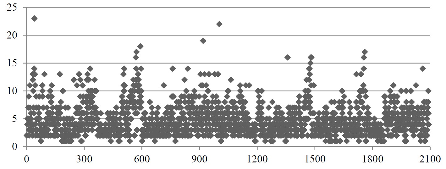 The headline length was 1–23 words (average 5; median 4; standard deviation 2.75) (Fig. 1). The headlines, containing either linguistic or communicative means, comprised 67 %; among these stylistic — 57 % and communicative — 10 %. The majority of the stylistic techniques were characterized as lexical (31 %), followed by syntactic (23 %), and phonetic (3 %). Considering sentencebased headlines, the total number was 82 %. Graphic tools included capitalization (61 %) and dots at the end of headlines (59 %). Morphologically, the headlines had the nominative (65 %), and attributive (8 %) structure. Syntactically, the headlines had the structure of a sentence with the predicate (16 %), elliptical sentences among those (0.6 %), imperative sentences (8 %), gerundial phrases (4 %), and questions (1 %).