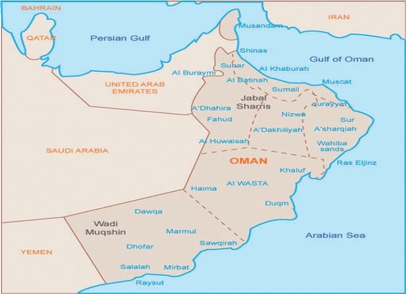 Султанат Оман делится на административные единицы — мухафазы, или провинции, за которыми закреплены названия — Дофар, Маскат, Мусандам, Северная аль-Батына, Южная аль-Батына, Северная аль-Шаркия, южная аль-Шаркия, аль-Дахилия, аль-Захира, аль-Бурейми, аль-Вуста (см. Рис. 1). Сравнительный анализ их семантики показывает, что эта группа топонимов, во-первых, образует систему, для установления и понимания которой необходимо также учитывать крупнейшую горную гряду Омана аль-Хаджар الحجر al-hajar (на карте обозначена его наивысшая точка Джабаль Шамс), во-вторых, образна, в-третьих, строится на антропоморфическом сравнении. Если горы аль-Хаджар в буквальном переводе ‘хребет’, то провинция аль-Батына الباطنة al-baatynah, лежащая к югу от него, — ‘подбрюшье’. Это следует из сравнения с животом بطن batan. Провинция аль-Захира الظاهرة al-dhaahirah, тянущаяся к востоку от этого хребта, являет собой спину (от араб. ظهر dhahr ‘спина’). Соответственно, по отношению к ним в пространстве аль-Вуста الوسطى al-wustaa ‘центральные районы’ (от араб. وسط wasat ‘середина’), аль-Дахилия الداخلية al-daahiliyyah ‘внутренние районы страны’ (от араб. داخل daakhila ‘внутри’), аль-Шаркия الشرقية al-sharkiyyah ‘восточные районы’ (от .бараقرشلا ash-sharq ‘восток’).