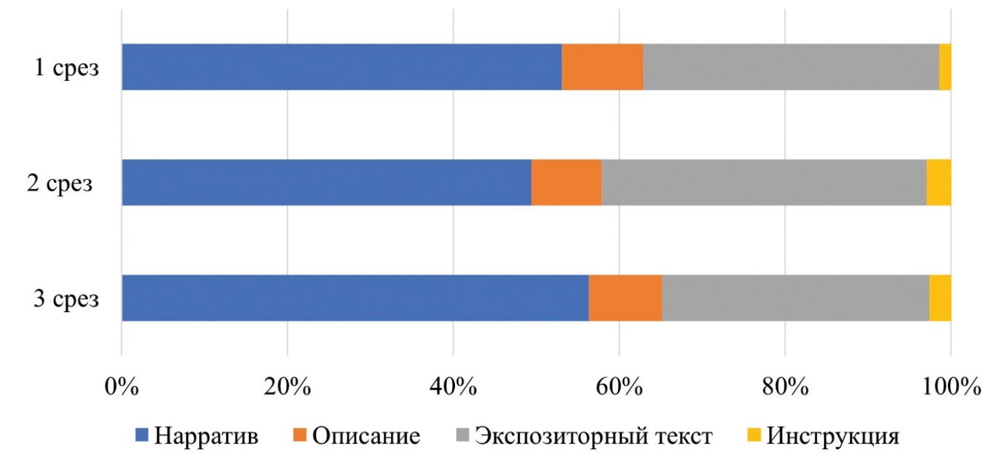 К первой группе можно отнести, например, большинство исследований в русле генристики [19; 21]. Ко второй группе относятся корпусные исследования, в которых предметом анализа являются структурные особенности дискурсивных текстов [22–24]. В исследованиях формирования устного дискурса у детей это направление представлено работами A. Applebee [25], A. McCabe [26], в которых рассматриваются такие доступные детям жанры, как бытовой разговор, нарратив, описание, рассуждение, инструкция и др. Нередко аналогичные термины используются для наименования макрожанров [27; 28], простых речевых жанров [29] или функционально-смысловых типов текста (речи) [30; 31]. Последние чаще применяются для композиционного анализа литературных текстов.