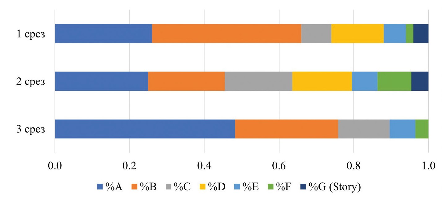 Особого внимания заслуживает выявленный у детей с ПТНР своеобразный регресс в распределении разных по зрелости форм нарратива, произошедший в третьем срезе. Он выразился в росте доли элементарной формы нарратива (типа А и B) и сокращении доли относительно зрелых его форм (типа F и G). Мы связываем его с тем фактом, что интервал между срезами 2 и 3 совпал с летним отдыхом детей, во время которого нередко происходит регресс недостаточно полноценно усвоенных знаний и навыков, особенно у детей с отклонениями в развитии [67; 68].