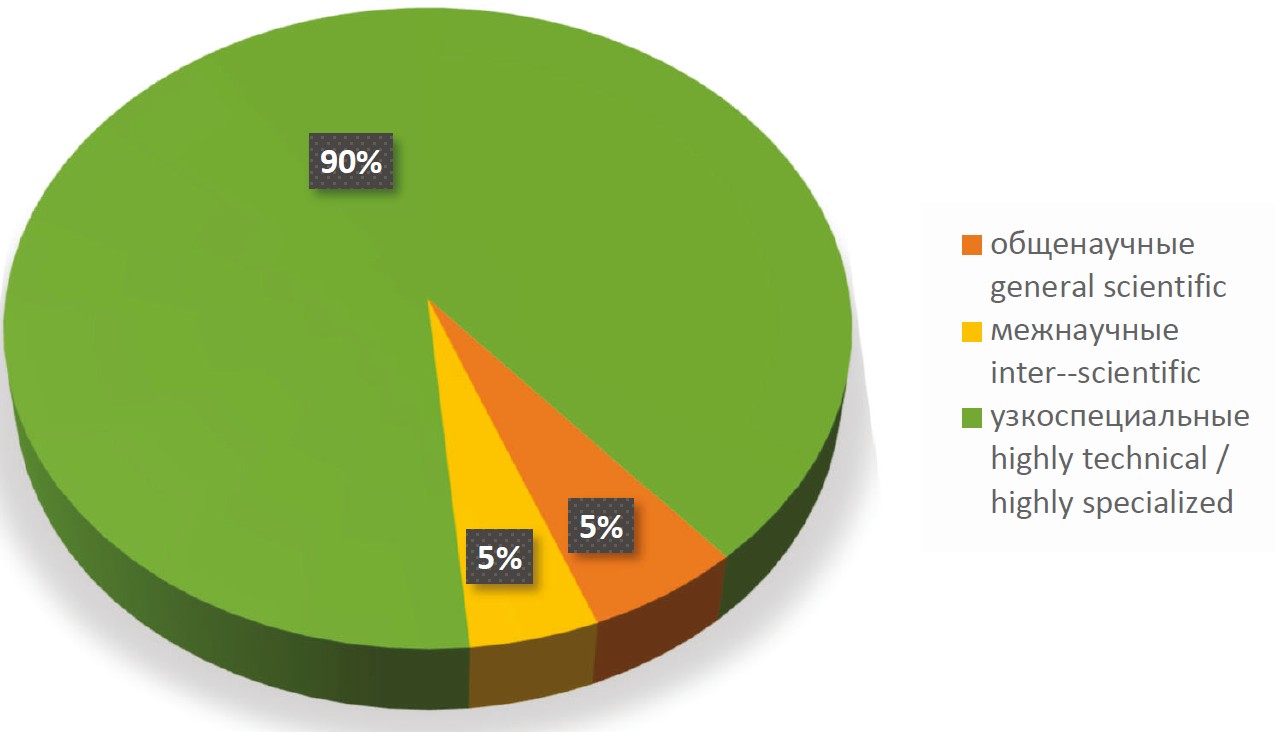 Следуя вышеизложенной классификации, методом сплошной выборки из указанных источников нами были отобраны 332 терминологические единицы. Проведенный анализ показал, что 18 единиц относятся к общенаучным, 15 — к межнаучным и, соответственно, 299 (90 %) к узкоспециальным терминам, отражающим реалии, понятия и категории, специфичные для данной отрасли знания. Результаты исследования представлены в форме диаграммы (рис. 1).