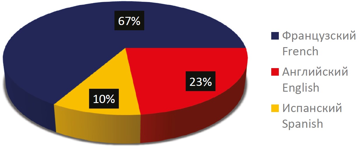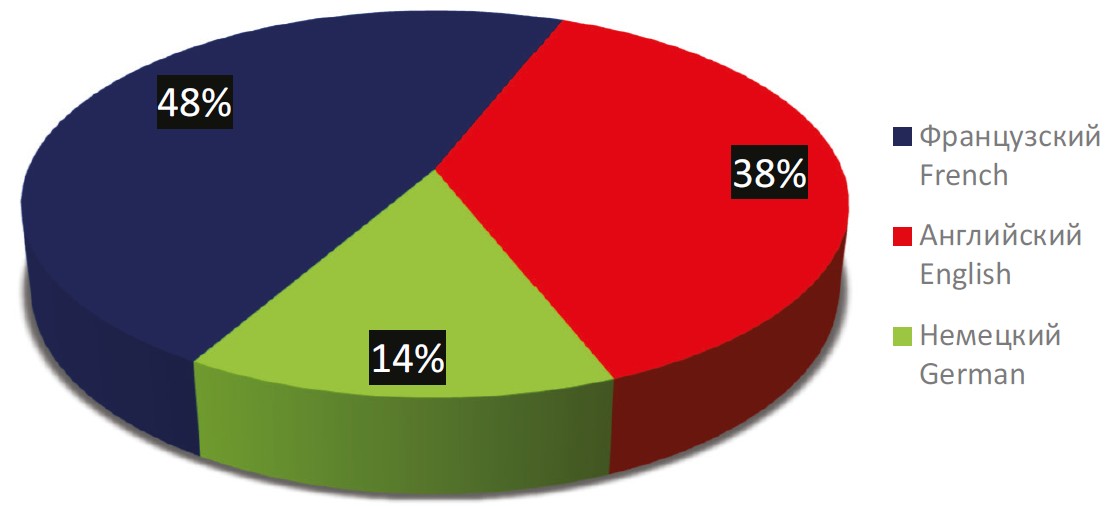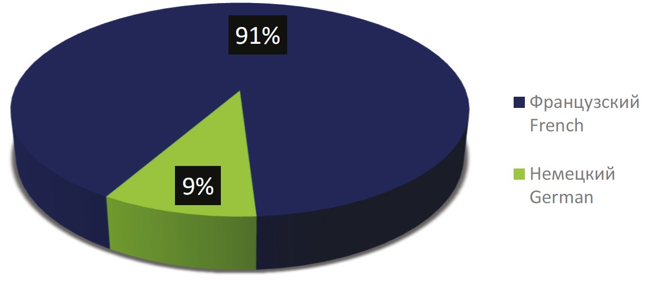 Английский язык, в свою очередь, заимствовал в свой лексический состав 91 % интернациональных терминов изучаемой области из французского языка и 9 % из немецкого. Интересно также заметить, что несмотря на статус английского языка как языка глобализации, доминирующего практически во всех областях научного знания, в процессе интернационализации терминологии космического приборостроения он играет второстепенную роль после французского языка (рис. 3).