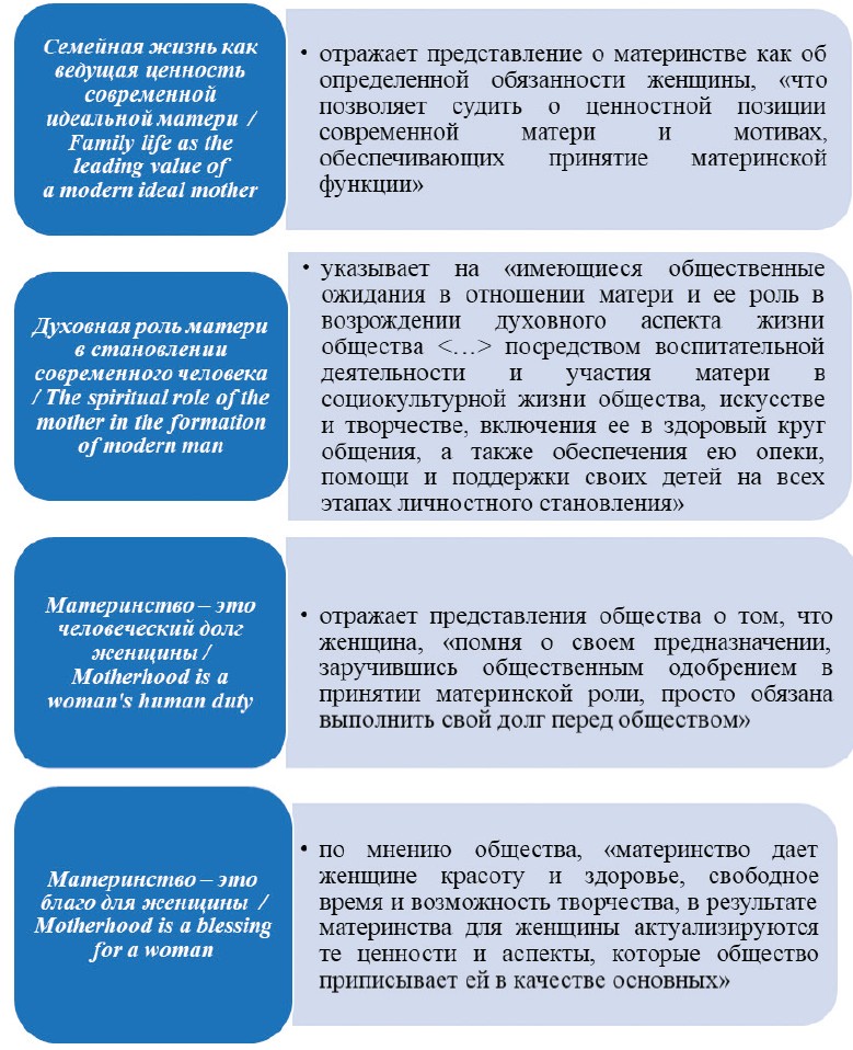 Рассуждая о современной истории российского общества, представляется значимым выделить основные черты образа женщины-матери, актуальные в XX и XXI вв. Так, в Советском Союзе женщина-мать должна была соответствовать следующим критериям: 1) «работать полный рабочий день; 2) осуществлять воспитание детей, частично разделяя эту обязанность с государственными институтами и родственниками; 3) отвечать за организацию быта» [10. С. 5–6]. В современном российском обществе ценности семьи и материнства лежат в основе государственной политики в области демографии, направленной на повышение рождаемости. Так, женщинам, имеющим детей, оказывается разного рода материальная поддержка от государства в виде пособий по беременности и родам, уходу за ребенком, жилищных субсидий, льготной ипотеки. Но, несмотря на все вышеизложенное, усиливаются тенденции, которые «проявляются в ориентации женщин на профессиональную деятельность, осознанном отказе от материнства и снижении ценности ее воспитательного вклада в жизнь детей» [1. С. 124].