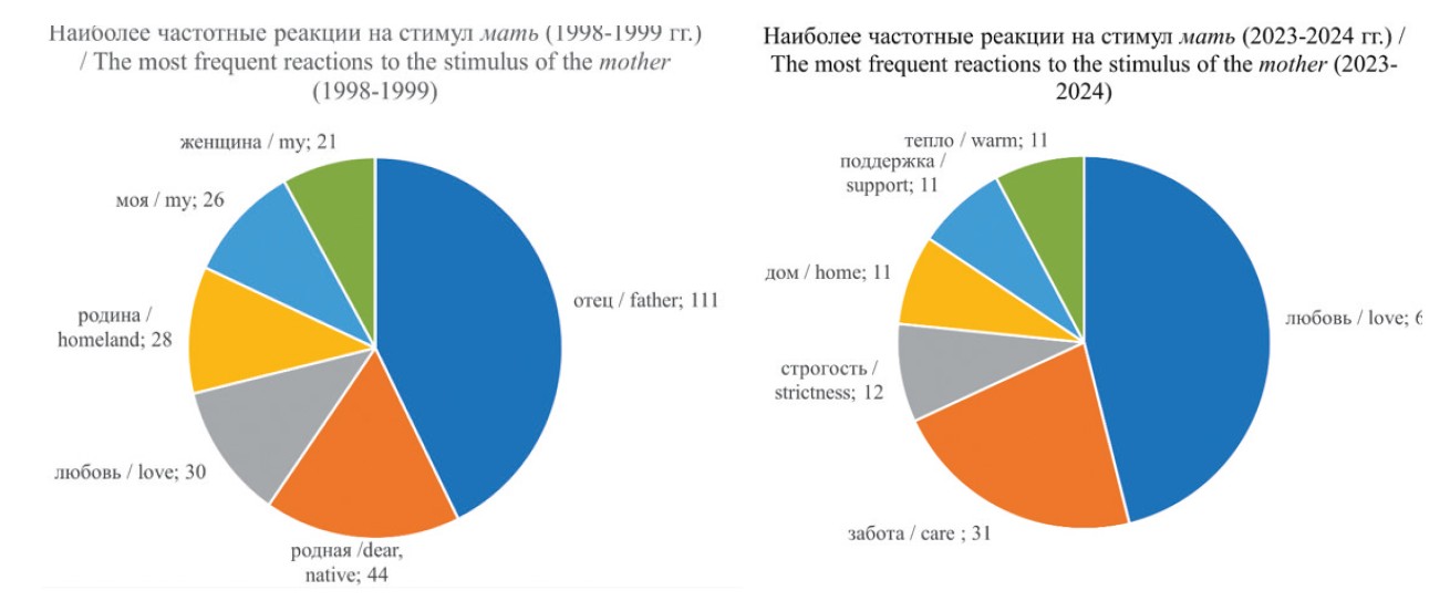 Для верификации понятийных признаков концепта МАТЬ и выявления динамики образных и ценностных признаков исследуемого концепта обратимся к данным ассоциативных экспериментов, проведенных среди студентов в 1998–1999 гг.[10] и 2023–2024 гг. в Российском университете дружбы народов имени Патриса Лумумбы.
