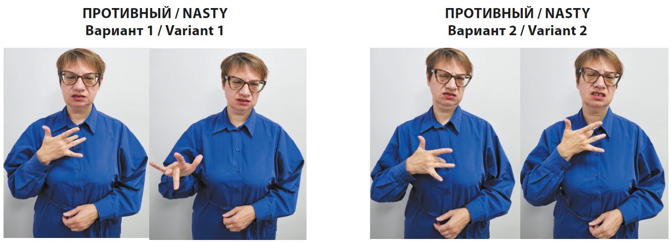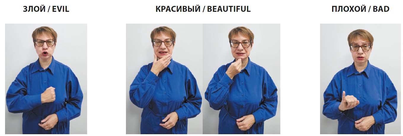 В жестовых языках, отличающихся аморфностью (отсутствием грамматических категорий, таких как время, род и число), выражение лица и движение тела фактически выполняют грамматические функции. Эмоциональная выразительность играет ключевую роль в структуре предложений РЖЯ. Например, выражение слов КРАСИВЫЙ, ЗЛОЙ или ПРОТИВНЫЙ сопровождается специфической мимикой и движениями тела, которые усиливают эмоциональное воздействие и уточняют смысл высказывания. Самыми «легкими» с точки зрения эмоциональной выразительности являются слова, имеющие качественные характеристики: ЗЛОЙ, КРАСИВЫЙ, ПРОТИВНЫЙ, ПЛОХОЙ. Жест КРАСИВЫЙ — более мягкий, при его исполнении тело расслаблено и немного движется вперед. Злость вызывает негативные эмоции, поэтому мимика лица более жесткая, брови сведены и насуплены, глаза прищурены, тело каменеет, плечи слегка поднимаются, движения руки становятся резкими. При этом чем сильнее передается ЗЛОСТЬ, тем больше амплитуда движения руки. При передаче значения ПРОТИВНЫЙ и глухой, и слышащий невольно морщатся, а к жесту добавляется мимика: лицо приобретает презрительное выражение, тело ведет себя так же — достаточно резко отклоняется назад (рис. 1, 2).