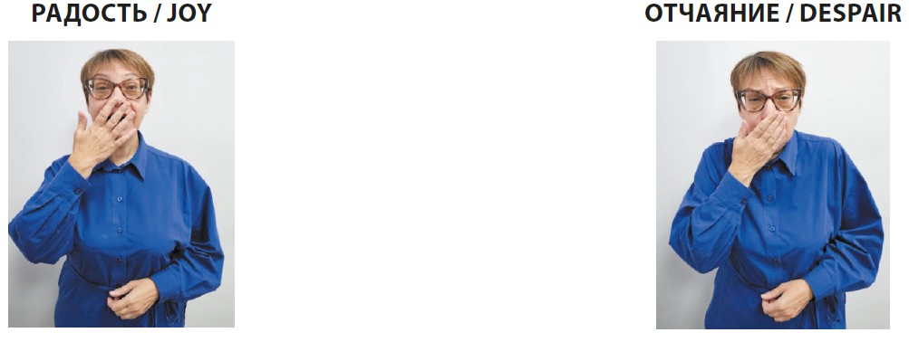 Если в словесном языке при передаче эмоциональной составляющей мы ориентируемся на интонацию, то в жестовом языке без дополнительной подсказки порой невозможно распознать, выражается радость или отчаянье в момент восклицания, поскольку описание данных жестов практически совпадает/идентично (рис. 3).