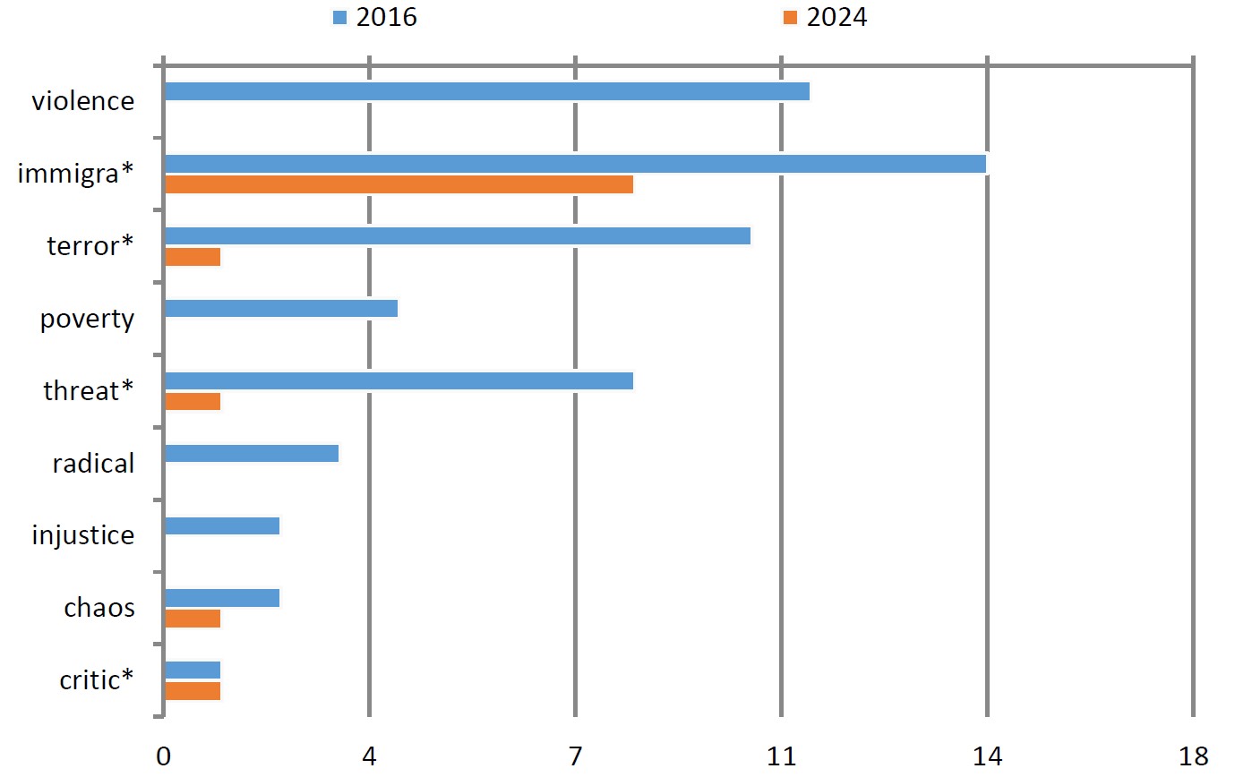 Figure 2. The decrease in the frequency of weaponised language in 2024 compared to 2016
