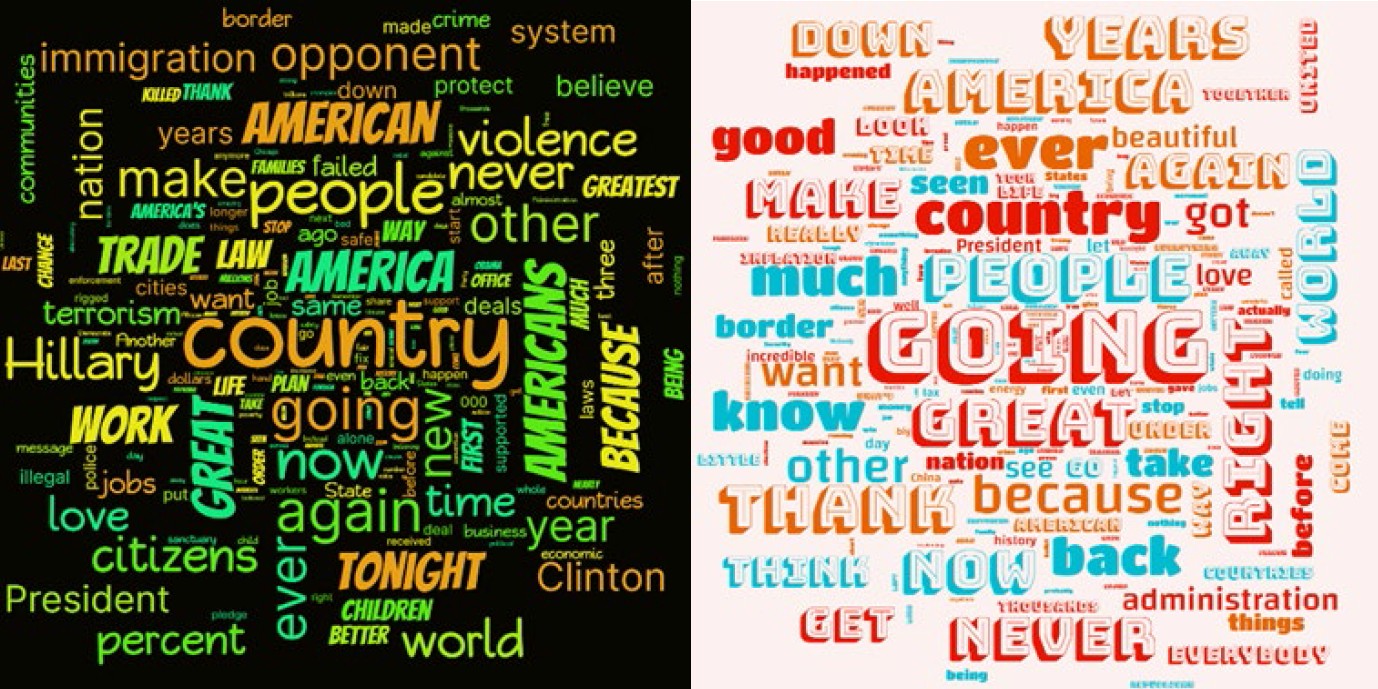 Figure 3. The word cloud shows Trump’s speeches representation with word size highlighting frequency of the most common lexis in their responses