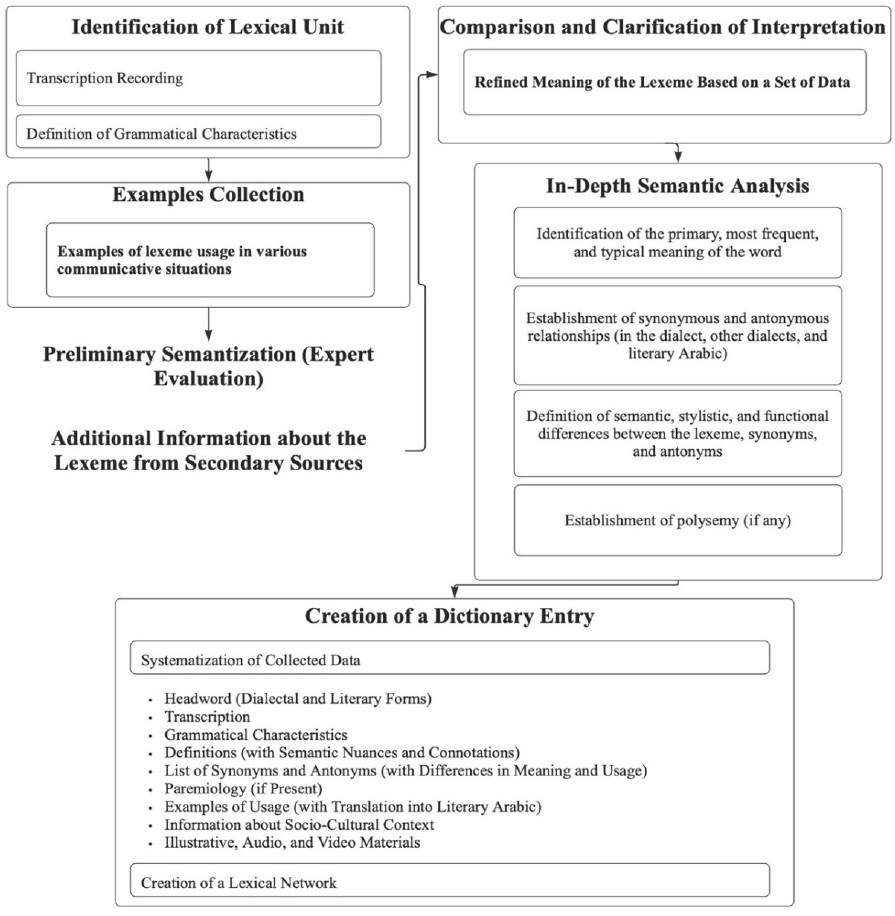 The research comprised several stages, one of which involved analyzing existing trends in the study of Arabic dialects and reviewing contemporary scholarly works. The materials for this research included scientific articles and monographs focused on the Syrian dialect of Arabic, as well as comparative studies of various Arabic dialects. The final stage entailed the development of a multimedia dialect dictionary for the Syrian dialect of Arabic, incorporating elements of the lexical network of the Arabic language1.