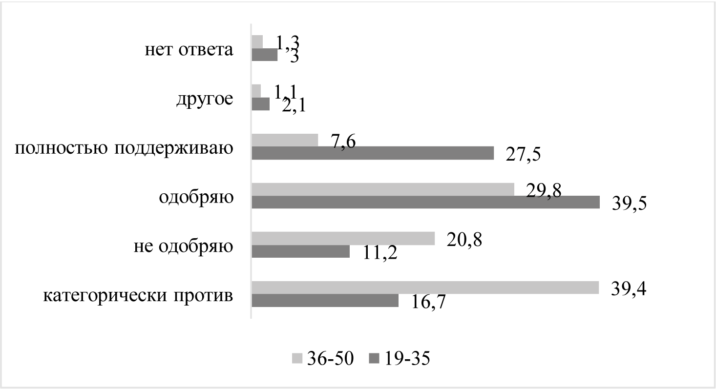 Исследование подтвердило снижение значимости регистрации брачных отношений и различие взглядов респондентов разных возрастов. Родители (36–50 лет) настроены более категорично в отношении незарегистрированного брака (среди них тех, кто «категорически против» такой формы отношений, в два раза больше — 41,8%, чем среди молодежи — 21,2%). С другой стороны, молодые люди (19–35 лет) чаще поддерживают незарегистрированные браки — 42%, что существенно больше, чем среди респондентов старшего возраста — 11,6% (Рис. 1).