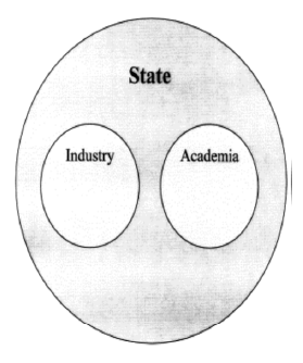 Теория «тройной спирали» считается основным инструментом управления наукоемкими инновациями на региональном, национальном и международном уровнях. За два десятилетия она получила развитие во многих странах, которые поставили задачу создания инновационной экономики [14– 16; 23; 24]. Основной путь реализации «тройной спирали» — это взаимодействие государства (state), бизнеса (industry) и институтов, обеспечивающее прирост научного знания, его аккумулирование и распространение (academia), причем возможны разные конфигурации взаимодействия основных игроков этого процесса в ходе развития экономики [27] (от Рис. 1 к Рис. 3).