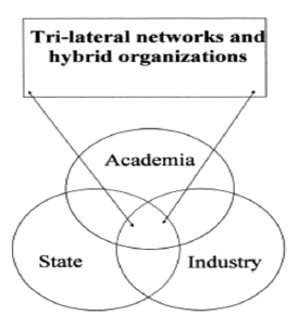 На Рисунке 1 показана патерналистская модель, когда государство определяет правила игры, а основные стейкхолдеры — бизнес и институты знания — существуют сами по себе. На Рисунке 2 государство стремится установить диалог между основными игроками, и налажено сотрудничество (партнерство) между бизнесом (наукоемкие производства) и институтами знания. Рисунок 3 соответствует завершающему витку «тройной спирали» — здесь отражены равноправные (наиболее важный аспект) отношения между всеми игроками, и сформировалась наиболее перспективная для инновационных процессов сеть трехсторонних смешанных организаций (tri-lateral networks and hybrid organizations). Именно этот виток «тройной спирали» представляет наибольший интерес: возникает сеть институтов, организаций и сложившихся практик, обеспечивающих наиболее эффективную кооперацию всех участников инновационного процесса. Гибридные организации становятся основным игроком, который обеспечивает диалог государства, бизнеса, науки и образования. Они же институционально и фактически обеспечивают конкурентную среду (например, биржи научной продукции), маркетинг и реализацию высокотехнологичной продукции, патентование и защиту интеллектуальной собственности, приток инвестиций.