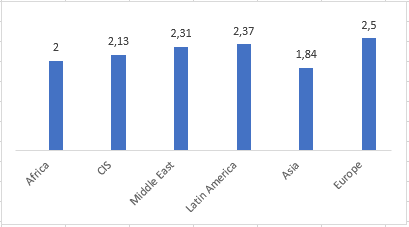 All these aspects are subject to consideration within each specific culture, but the primary consideration of domestic violence should start with the cultures themselves, specifically the social-cultural characteristics of societies. Looking at the attitude towards people with disabilities in Russia, you can see that legislative acts cannot guarantee the progress of a particular issue without addressing public opinion and the study of social representations. The attitude to certain issues varies from one culture to another. For instance, in the RUDN study conducted in 2017, 416 people were interviewed representing the main faculties and institutes of the RUDN, taking into account the quotas — course and region of foreign students (Middle East, Europe, East Asia, CIS, Africa, Latin America). They were asked: “What is your attitude to the situation when a parent shouts at a child in a public place, on a scale from 0 to 5, where 0 — I find it difficult to answer, 1 — I consider it completely unacceptable, 5 — I consider it completely acceptable”? (Fig. 3). European students showed a calmer attitude to this phenomenon than students from Asia, even though such a social action is generally not approved. This example is