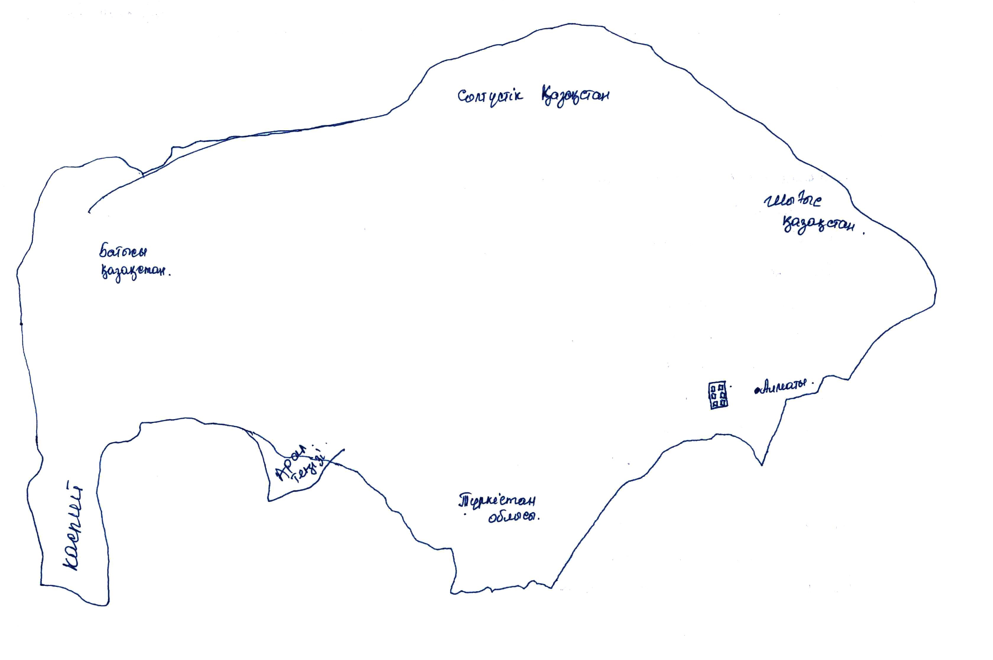 Ментальные карты позволяют зафиксировать подходы информантов к изображению территориальной структуры: видимо, это ее пространственное видение, которое отражает знания о территории страны. Первый критерий территориальной узнаваемости — школьные «компасные» знания (восток, запад, север, юг) (Рис. 1): Восточно-, Западно-, Северо- и Южно-Казахстанская области.