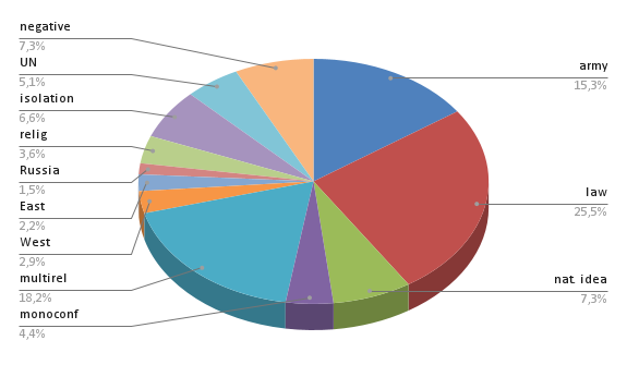 The second most important trend is the commitment to the inter-ethnic and inter-confessional consensus, including the intra-confessional agreement between different branches of Islam (18.2%), which suggests no single confession dominating, with the option of building a secular state being possible. It should be noted that the uniqueness of the region (it is especially evident in Lebanon) is the propagation of confessionalism in all spheres of society; confessional affiliation continues to dominate over national identity [3], and this can both consolidate and mobilize society and increase the potential for conflict. At the same time, influential political forces in Lebanon criticize the existing confessional system and insist on the need to build a contemporary secular state with equal rights for all citizens, regardless of their religion [15. Р. 18]. The Lebanese President Michel Aoun called to abandon the confessional system of power formation in Lebanon and turn it into a secular state [12].