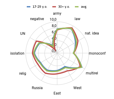 The older group scored higher than the younger group the role of international legal institutions (7.6 and 6.3 points, respectively) and the implementation of a religious project (7 and 6.1 points). The comprehensive negative trend (insecurity, economic crisis, lack of prospects for young people) has low values (1.3 and 2.8), which respondents primarily express after 30 years, and this is understandable: young people are the most vulnerable part of society, their unemployment rate is significantly higher than the average one.