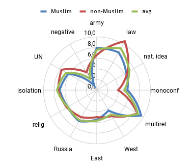 While the West position is low overall, it is weaker in the Muslim subgroup than in the non-Muslim one. Attitudes to the negative trend are significantly higher among non-Muslims (4 vs. 0), and they are more inclined to emigration. If the question was “What can ensure the national security of your country and region in your opinion?”, one of the answers was pessimistic — “hardly anything can help, the situation is almost hopeless”; while one of the answers to the question “What will save your country/region?” was “nothing will save it anymore; the region and our country are at a dead-end”. Regarding the economic development, one of the answers was “the economy of my country and region is moving to a crisis or collapse, and the best thing to do now is to leave”. Finally, the question “What do you think young people in your country are looking forward to right now?” offered the answer “to emigrate, to live and work in a developed safe country”. In general, this category of answers has the lowest positions in the ranking, but there are statistically significant differences between two subgroups: non-Muslims are more pessimistic, some of them plan emigration, while in the Muslim subgroup, the significance of the negative trend is close to zero.