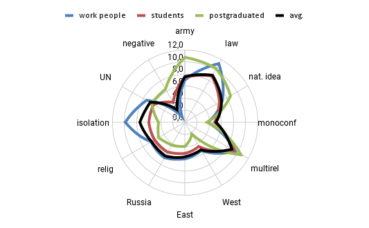 A comparative analysis of preferences by ‘status’ (students, postgraduate students and employed) allowed to interpret the data more correctly (Figure 5). The average for the UN is 6.5, for the East — is 5.5, and for the West — is 3.5. The group of postgraduate students demonstrated the maximum demand for poly-confessionalism (11), army (11), law (10), and national idea (9); the group of employed — for law (11), isolation (10), poly-confessionalism (10), and national idea (7) (with zero for the negative); the group of students — for law (9), poly-confessionalism (9), army (7), and national idea (7). In general, the peaks are specific for the groups of employed and students, but all three groups showed concern about the trend of mono-confessionalism in the region (3).