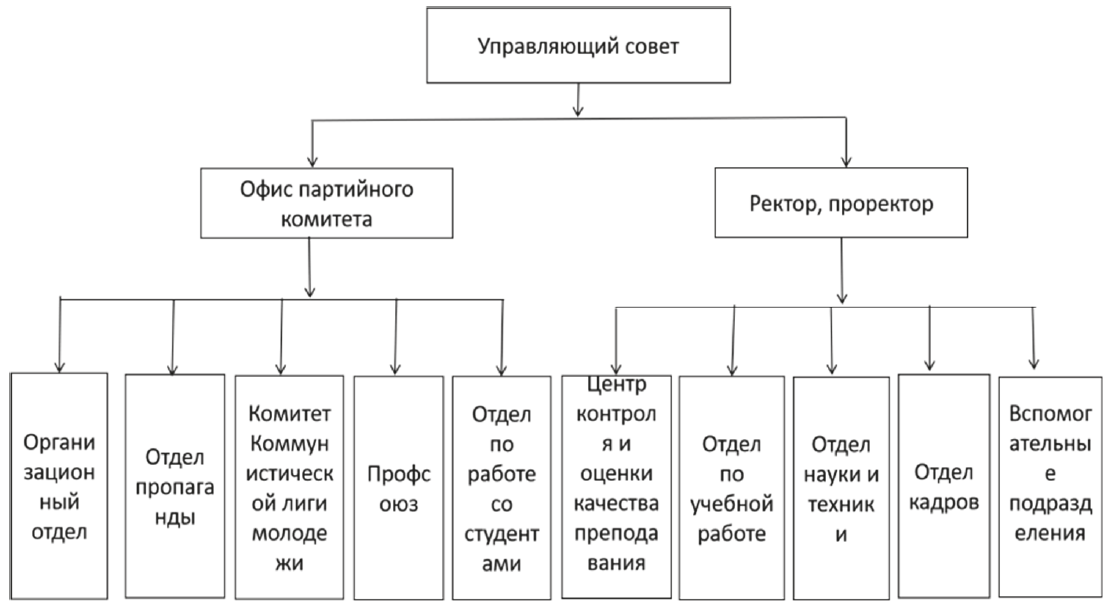 Согласно статье 39 Закона КНР о высшем образовании (14), управление государственными вузами предполагает ответственность ректора перед руководством Первичного комитета КПК, т.е. ректор является главным представителем исполнительной власти в университете, руководит его развитием и отвечает за повседневное управление. Он обладает такими полномочиями, как разработка планов развития и контроль их реализации, организация преподавательской деятельности, научных исследований, идеологического и нравственного воспитания, планирование создания подразделений университета, рекомендация кандидатов на должности проректора и руководителей подразделений, назначение и увольнение преподавателей и других сотрудников, управление средствами и имуществом университета, защита законных прав и интересов университета и т.д. [10]. Кроме ректора, к исполнительной группе руководителей относятся проректор, деканы и заведующие структурными подразделениями.