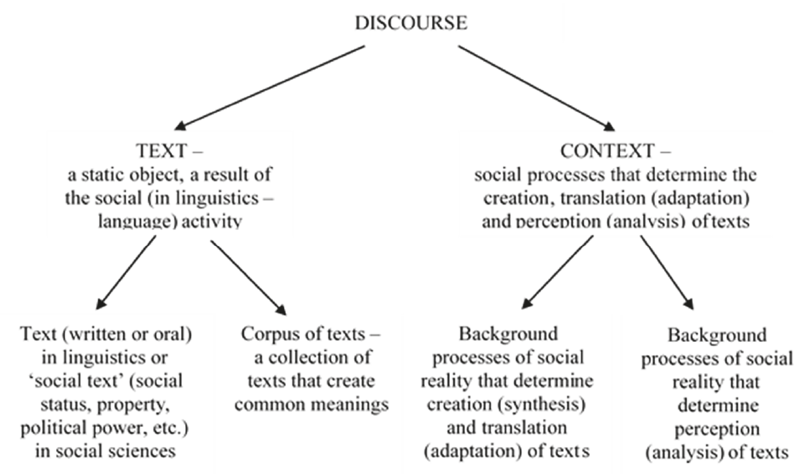 “Usually discourse and text are opposed to each other using a number of criteria: functionality/structurality, process/product, dynamics/statics and actuality/virtuality” [6]. We believe that, according to Van Dijk who identified two aspects of the discourse analysis — textual and contextual [62], we can define discourse in linguistics as a text in a context. Such a definition can be applied in any science, art and other human activity, while the ‘text’ should be defined broader — as a product of any human activity. For instance, in music, discourse is a piece of music (musical text) in the context of the social reality it was created in (and/or perceived), in painting — a piece of art (visual text) in the same type of context, in sociology — a social status (social text) (1), in economics — a property (economic text), in the industry — a car (technical text), etc.