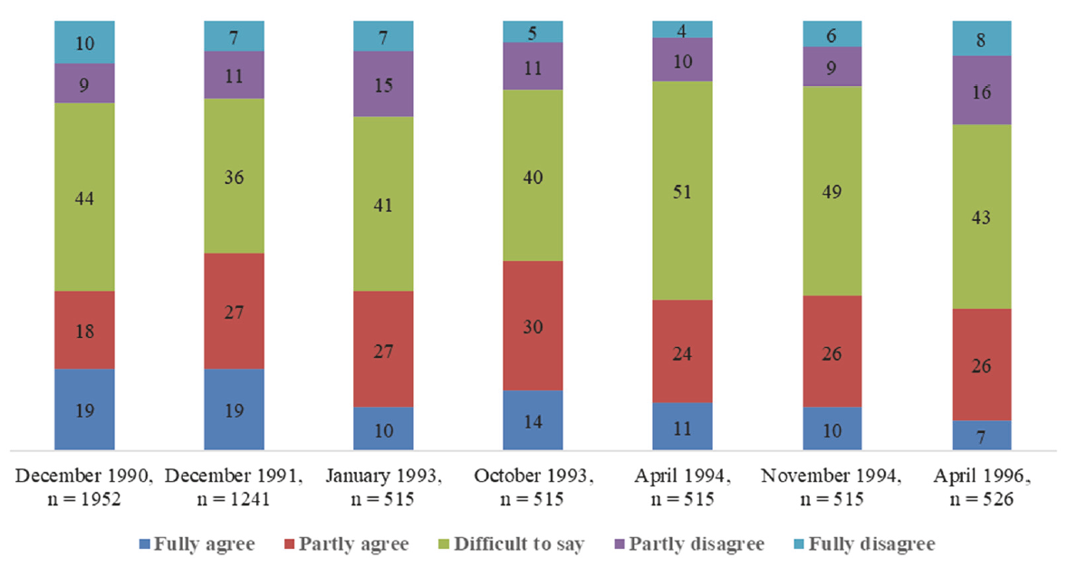 Fig. 2. “Do you agree that the transition to the market economy will help our society overcome the crisis and ensure a normal life?” (%, 1990–1996) [31]