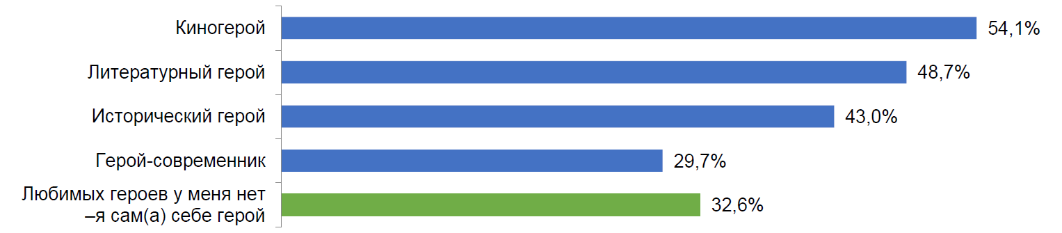 Одно из подтверждений такого предположения — ответы молодежи на вопрос о любимых героях и лидерах мнений. В отношении героев ответы в целом оказались ожидаемыми: среди киногероев (самая многочисленная категория) доминируют представители зарубежного экшн-кинематографа, такие как «герои Марвел», «Человек-паук» и т.п.; среди литературных героев — персонажи русской классической литературы (благодаря школьной программе) с небольшим добавлением персонажей зарубежной классики; среди исторических героев (43 % респондентов) — отечественные правители и полководцы, Петр 1, Екатерина Великая, Суворов, Жуков; среди геро ев-современников — кто-то из родителей или близких родственников, пра дедушек-участников войны и Путин. Обобщенные (без персонификации) ответы на этот вопрос представлены на Рисунке 2. Обращает на себя внимание количество респондентов, выбравших вариант «любимых героев у меня нет — я сам(а) себе герой» — 33 %: за 5–8 лет этот показатель вырос в 1,5 раза (2013 — 18–19 %, 2017 — 21–23 %).