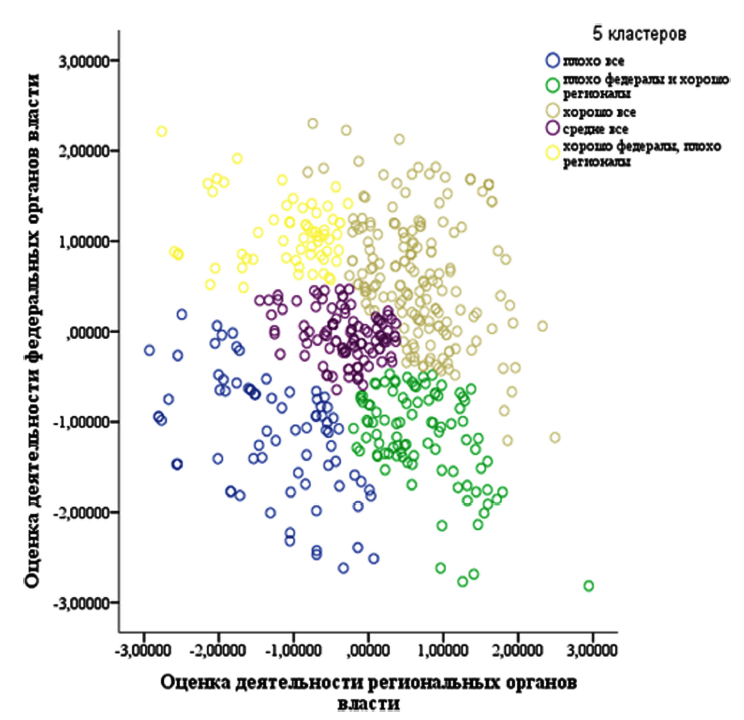 Для формирования групп экспертов, имеющих схожие позиции по отношению к работе органов власти, использовался иерархический кластерный анализ методом Ворда, который позволяет создать компактные кластеры, не пересекающиеся друг с другом. В основу кластеризации были положены две независимые переменные: оценка деятельности федеральных органов власти и региональных властей. Кластерный анализ позволил выделить пять 5 социоментальных групп: 1) эксперты, которые положительно оценивают деятельность всех органов власти в рамках реализации национальных проектов, их оценки выше 3,5 баллов (Фх_Рх); 2) эксперты, положительно оценивающие деятельность федеральных органов власти (выше 3), и средне — региональных (около 3), т.е. группа федерально-ориентированных экспертов (Фх_Рп); 3) эксперты, удовлетворительно оценивающие деятельность и решения федеральных и региональных органов власти (около 3), т.е. «колеблющиеся» (Фс_Рс); 4) эксперты, положительно оценивающие деятельность региональных органов (выше 3), но несогласные с федеральным курсом и деятельностью федерального центра (ниже 3), т.е. регионально-ориентированные эксперты (Фп_Рх); 5) «противники» — оценивающие решения федеральных и региональных органов власти ниже 2,5 баллов (Фп_Рп). Еще одна группа экспертов — затруднившиеся в оценке органов власти.