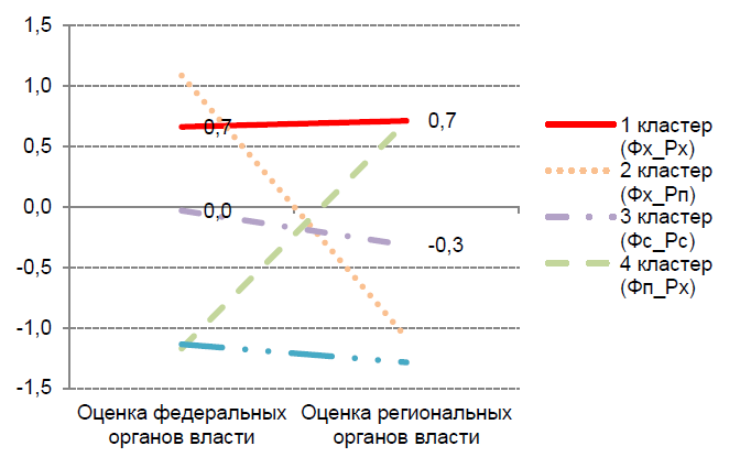 Рис. 2. Средние оценки деятельности федеральных и региональных властей экспертов, принадлежащих разным кластерам
