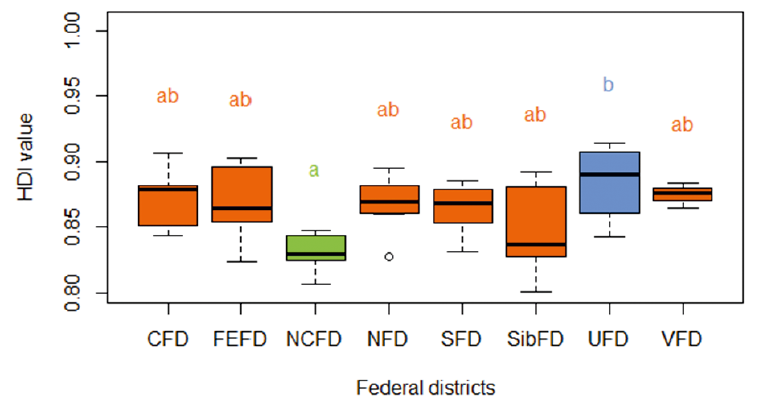 If we examine the distribution of the the HDI indices by border regions grouped by federal districts, we will see non-significant mean values in 6 out of 8 federal districts — from 0.848 to 0.875 (Fig. 1). In each federal district, there are leaders and outsiders according to the regional economy and possible investment in human resources. In the Siberian Federal District, the leaders are the Krasnoyarsk Region, one of the most developed export-oriented industrial regions of Russia (0.892), the Novosibirsk Region — the administrative center of the federal district and the leading scientific center with the diversified economy and a strong industrial sector (0.883), and the Omsk Region — an industrial-agrarian region (0.879). The Republics of Buryatia and Altai and the Republic of Altai with the significant share of agrarian and tourist-recreational sectors and the low level of urbanization show a moderate human development (0.826–0.838), while the Republic of Tyva has the smallest HDI in Russia (0.801). In the Far Eastern Federal District, there are three border regions with the primary-products oriented economies and developed mineral industries, whose HDI is very high and comparable with some European or SouthEastern high-income countries: Republic of Sakha (0.903), Magadan (0.897) and Sakhalin (0.896) Regions. The least fortunate regions are the Jewish Autonomous Region (0.824) and the Transbaikal Territory (0.836) — rich in mineral reserves but peripheral and the most ‘abandoned’. Other border regions of this district have rather modest HDI — from 0.840 in the Amur Region to 0.867 in the Chukotka Autonomous Region.
