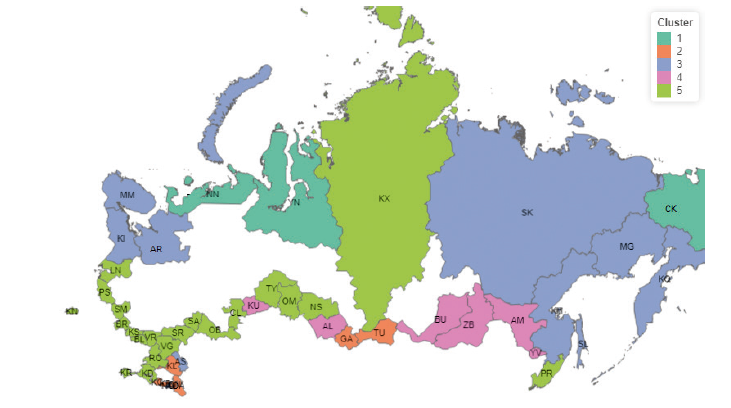 The cluster analysis with 11 integral indices of social security allowed to identify 5 main groups of border regions (Fig. 2). The first cluster consists of 3 regions — Chukotsky, Nenetsky and Yamalo-Nenetsky Autonomous Regions (AR) with the very high level of social security except for mental health and suicides. The second cluster consists of 8 the least-advantaged regions — Karachay-Cherkessia, Kabardino-Balkar, Ingush, Chechen, Kalmyk, Dagestan, Tyva and Altai Republics, in which 6 out of 11 factors indicate low standards of living, problems in the labor market, weakness of the health care system, high pressure on the social security system, and low access to information technologies. However, these regions show higher demographic security, physical and mental health, a relatively low level of crime and a favorable ecological situation. The third cluster includes regions with favorable conditions for 10 integral factors except for physical health: Arkhangelsk, Astrakhan, Magadan, Murmansk, Sakhalin, Khabarovsk, Kamchatka Regions, Republics of Karelia, Sakha, North-Ossetia. The fourth cluster was formed by the Republic of Buryatia, Kurgan, Amur, Transbaikal, Altai and Jewish Autonomous Regions, in which the main threats to social security are the problems of the socialeconomic development and employment, law standards of living, weaknesses in the health care system, mental health of the population, poor access to information technologies. At the same time, there is a relatively high level of physical health and a developed social infrastructure, and a better environment as a counterbalance to the social-economic difficulties. The fifth cluster consists of 21 regions in which social security is threatened by depopulation, undeveloped social infrastructure, problems with somatic health and ecological security. However, there are tendencies contributing to the positive development, such as a lower level of unemployment, a higher level of mental health and public safety, a better access to IT technologies. These are: Leningrad, Tumen, Pskov, Novosibirsk, Omsk, Smolensk, Bryansk, Rostov, Volgograd, Saratov, Belgorod, Kaliningrad, Chelyabinsk, Voronezh, Orenburg, Krasnoyarsk Regions, and the Republic of Crimea.