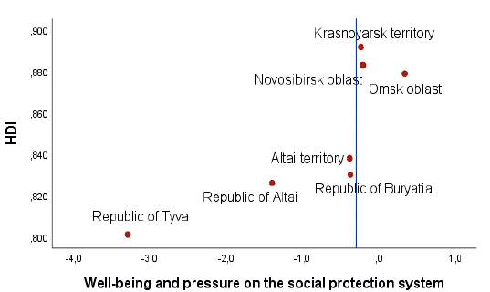 Fig. 3. Relationship between the HDI and the factor of well-being and pressure on the social protection system in the border regions of the Siberian Federal District