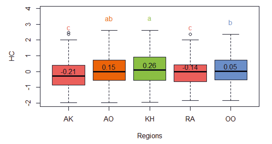 (significant differences at the 5 % level at least are marked with the same color and letter) AK — Altai Region, AO — Amur, KH — Khabarovsk Region, RA — Republic of Altai, OO — Omsk Region