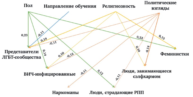 Таким образом, факторами, оказывающими наибольшее влияние, стали «Пол» и «Политические взгляды», а факторы «Воспитание», «Предпочтения СМИ» и «Частота обращения к СМИ» не оказали влияния на степень моральной эксклюзии. Была построена схема, которая наглядно демонстрирует наиболее весомые факторы (Рис. 1).