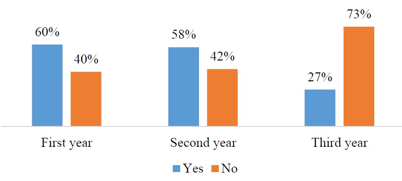 At the beginning of each academic year, students were asked to fill in a questionnaire to identify potential leadership. The survey aimed at identifying several indicators: the desire of students to become group activists, the desire to work individually, and the desire to take a leading position. During the first year, 73 % of respondents indicated that they would like to participate in the group of leaders (Fig. 1), 20 % would like to but were afraid, while 7 % were negative. In the second and third years, 58 % and 60 %, respectively, would like to be active in the group. Consequently, over time, the desire of students to become group activists decreased.