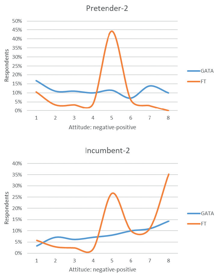 The data shows quite a common picture for all studied cases (4 incumbents, 8 pretenders): for the incumbent, explicit attitudes shift to the positive end of the scale (arrows down), while implicit attitudes — to the negative end (arrows up); for the pretender, implicit attitudes (30 % of respondents) shift to the positive end, while explicit attitudes do not. The explicit scale is dramatically shifted to the center, which can mean the respondents’ intention to hide in the ‘neutral’ zone due to their deliberate misreporting or lack of introspection.