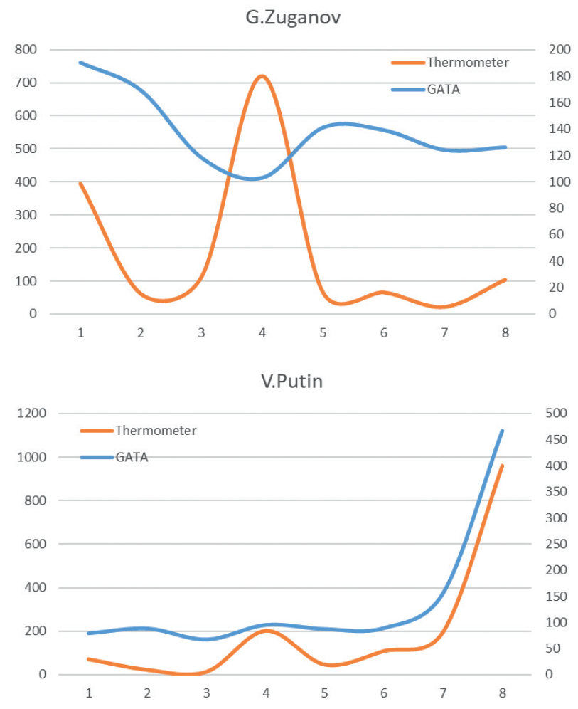 In general, the study confirms that the incongruity of explicit and implicit attitudes to the same candidate is not unusual. Figure 4 represents the mismatch of GATA’s and feeling thermometer’s data for the most popular opposition leader G. Zyuganov compared to the President V. Putin (Study 3). The opposition leader Zyuganov has a stronger implicit support than is showed by respondents explicitly, while the attitude to Putin is consistent, reflecting the national consensus proved by a range of sources — from mass polls to elections.
