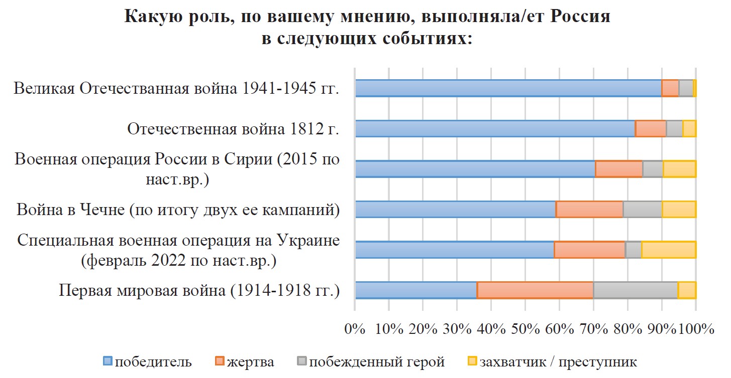 Распределение ответов на этот вопрос позволяет сделать следующий вывод о репрезентации коллективной памяти россиян: основная часть военных компаний, в том числе нынешних, воспринимается через образ победителя, причем там, где Россия была вынуждена обороняться, данная оценка однозначная, т.е., согласно культурной традиции, действия и отношения подлинного победителя не предполагают сговора и участия в сомнительных договоренностях — это, прежде всего, защита и оборона.
