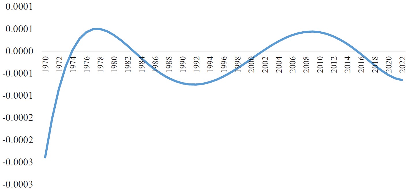 Figure 2. The derivative (rate of change) of the fertility function, 1970–2022, Latvia