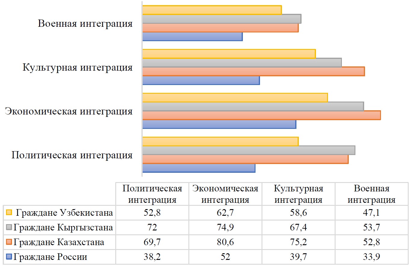 Несмотря на то, что Россия — ключевой участник евразийской интеграции, ее поддержка среди российской молодежи даже ниже, чем среди молодежи из Казахстана, Кыргызстана, Узбекистана. Для россиян в первую очередь важна экономическая интеграция (52 %), а не политическая, культурная и военная (менее 40 %). Уровень поддержки экономической интеграции мигрантами еще выше: граждане Казахстана — 81 %, Кыргызстана — 75 %, Узбекистана — 63 %. В политической интеграции заинтересованы три из четырех молодых мигрантов из Казахстана и Кыргызстана и каждый второй узбекистанец. Культурная интеграция не менее важна для респондентов из Казахстана и Кыргызстана, чем политическая, намного менее значима интеграция военная (каждый третий казахстанец и кыргызстанец, каждый второй выходец из Узбекистана) (Рис. 2).