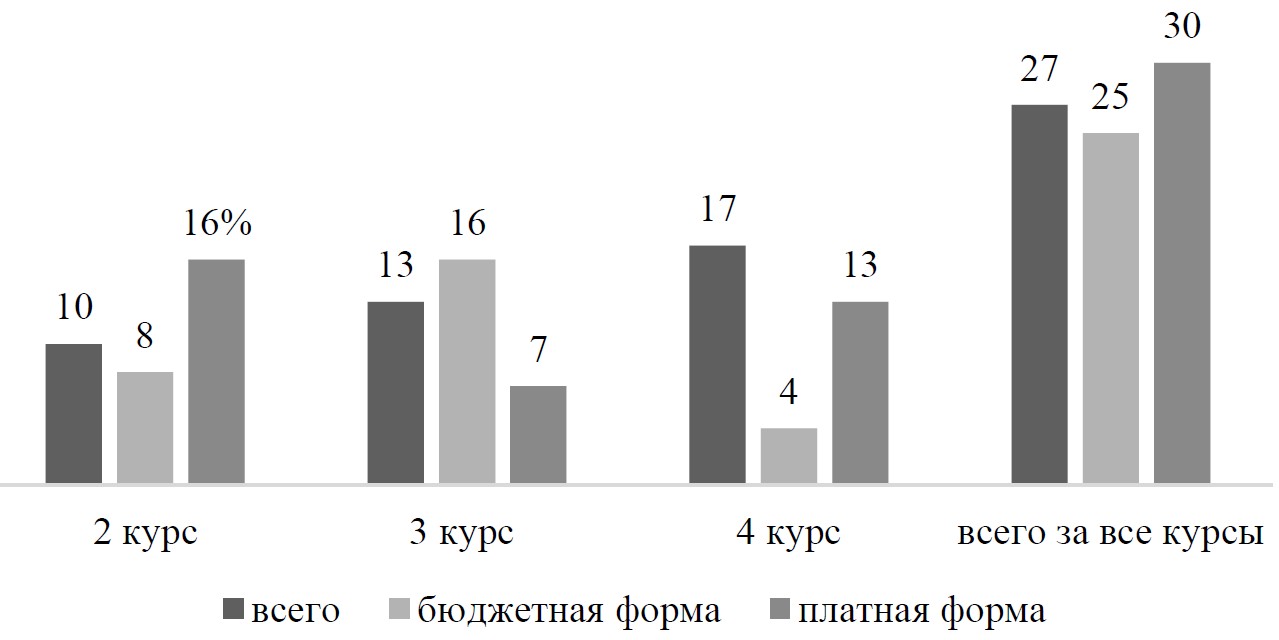 Вероятно, такое распределение отчислений связано, прежде всего, с пандемией covid-19 и негласным запретом отчислять студентов, переведенных на дистанционное обучение. Также одним из показателей, по которым Министерство науки и высшего образования выделяет бюджетные места, является «сохранность контингента», поэтому контрольные цифры приема на будущий год связаны с количеством отчисленных: чем меньше отчисленных студентов, тем больше бюджетных мест. Что и приводит к «бережному» отношению к неуспевающим студентам, порождает практику бесконечного числа пересдач и в конечном итоге доводит студента до дипломного проекта, который он выполнить не в состоянии, поэтому повышается доля отчисляемых с выпускного курса. Также существует проблема неотчисления студентов платной формы обучения, которых пытаются «сохранить» еще старательнее. Установка на «сохранение контингента» не дает студенту возможности поменять приоритеты на ранних курсах, что грозит обществу потерей хорошего специалиста, которым он мог бы стать, перейдя на другое направление подготовки на младших курсах, и получением плохого специалиста с дипломом (как правило, студенту выпускного курса дают возможность завершить обучение с выпускной работой, соответствующей минимальным стандартам ФГОС). Сюда следует добавить абсолютное игнорирование рабочего времени профессорско-преподавательского состава, вынужденного принимать «бесконечные» пересдачи, что приводит к психологическому выгоранию и/или снижению требований к студентам.