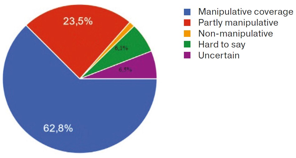 69 % of respondents believe that the most manipulated media contents are current social-political events, followed by the causes of war conflicts (56 %) and such conflicts in general (51 %), economic problems and crises determined by war conflicts (35 %), then come topical issues in the field of culture, education and healthcare (mentioned by every fourth respondent as prone to the media manipulation — 25 %, and, finally, reports on emergency situations caused by natural disasters (15 %).