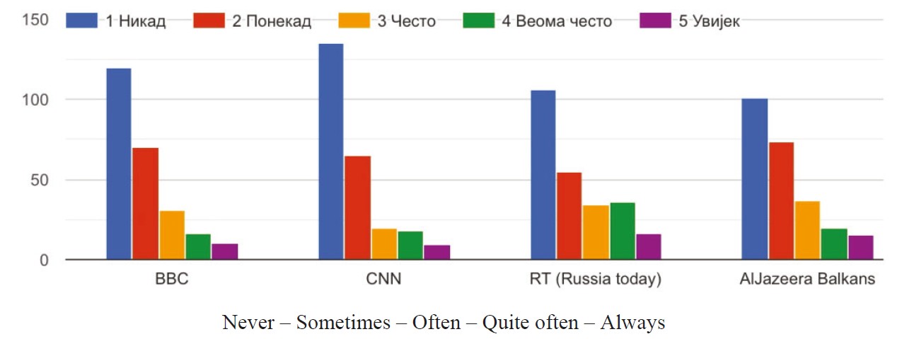 When asked about the leading media source of information on the events in Ukraine, students name mainly and with equal frequency the RTRS (Public Broadcast System of the Republic of Srpska), the BN, and the RTS (Public Broadcast System of Serbia). Among the foreign media companies covering the events in Ukraine, respondents seem to trust the RT (Russia Today) and the Aljazeera Balkans the most, then come the BBC and the CNN (Fig. 6).