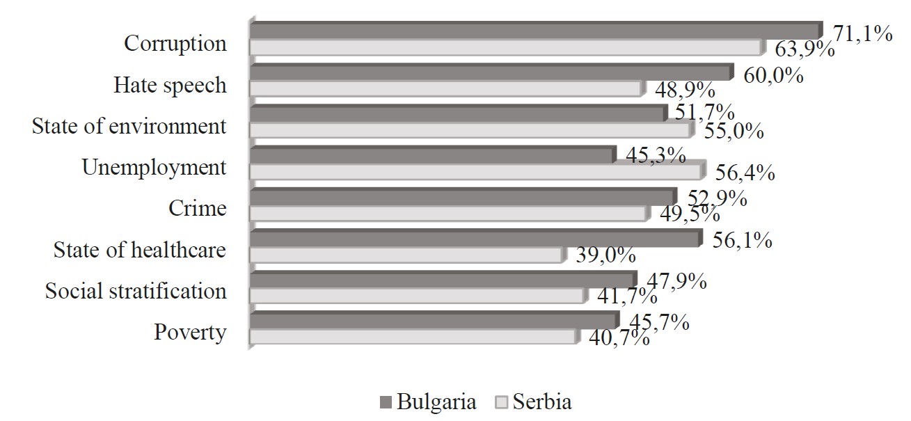 Bulgarian students rank crime third and hate speech fourth, which can be explained by the several-year pre-election situation in the country — fierce debates of political forces obviously contributed to the problematization of hate speech. Serbian students rank these issues fourth and fifth, and, as was the case with corruption, the data on crime is somewhat surprising, at least considering the transnational organized crime (Serbia is 33rd among 193 countries, Bulgaria — 70th).