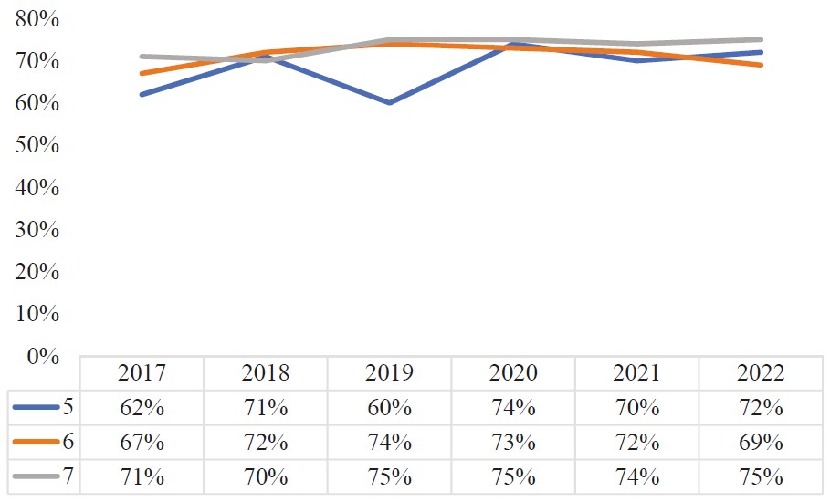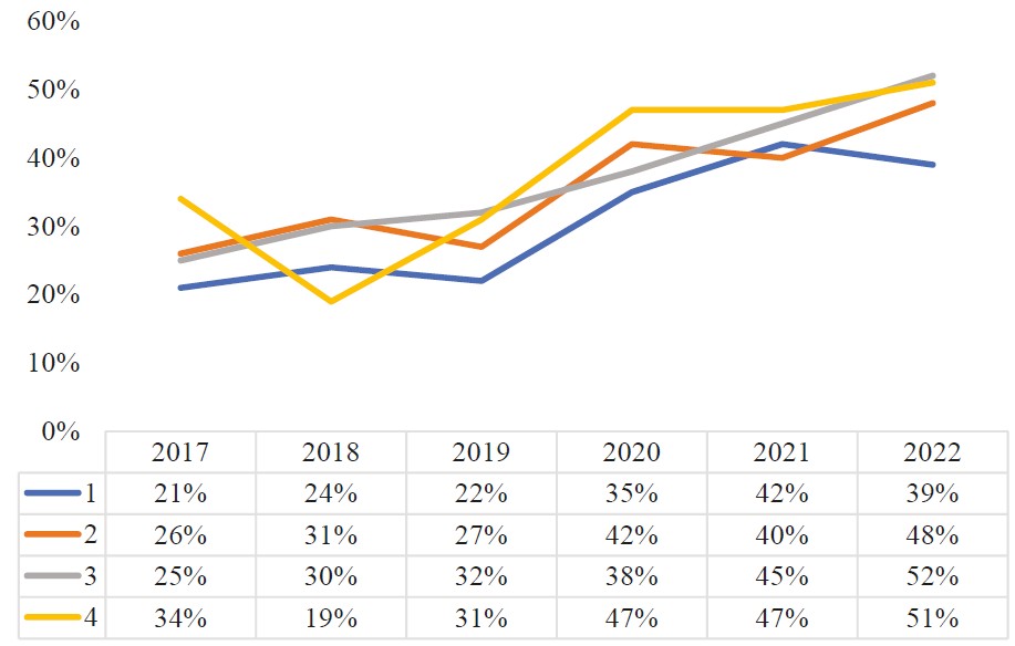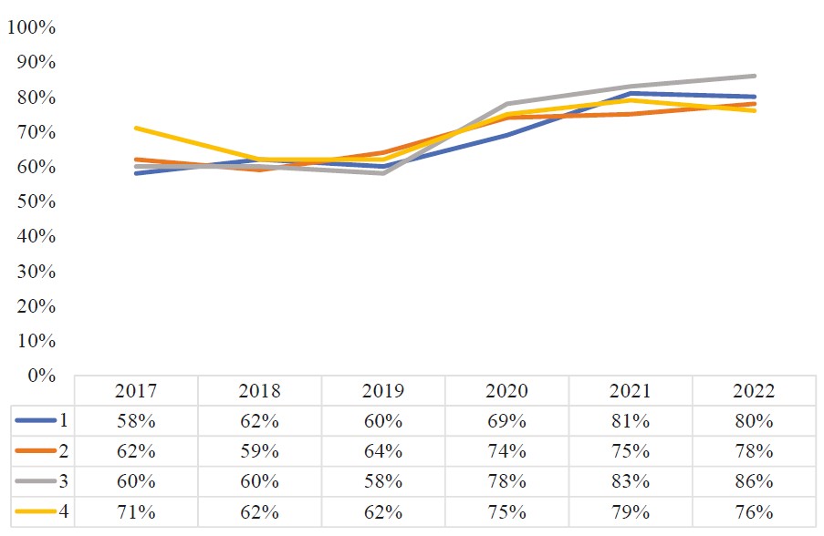 Количественные показатели, характеризующие эффективность разработанной авторами методики внедрения коучинга в образовательный процесс, — это средние значения посещаемости занятий и активности студентов, обобщенные за период с 2017 по 2022 годы. С 2019 года в образовательный процесс внедрялся коучинговый подход, поэтому для проверки гипотезы о его влиянии на формирование социального капитала обучающихся данные, полученные с 2017 по 2019 годы, сравнивались с данными, полученными с 2020 по 2022 годы. На рисунке 1 представлены результаты замера уровня посещаемости (среднее значение для списочного состава учебных групп 1–4) за исследуемый период. Начиная с 2019 года наблюдается рост посещаемости: состав групп менялся, но общий тренд роста посещаемости сохранялся.